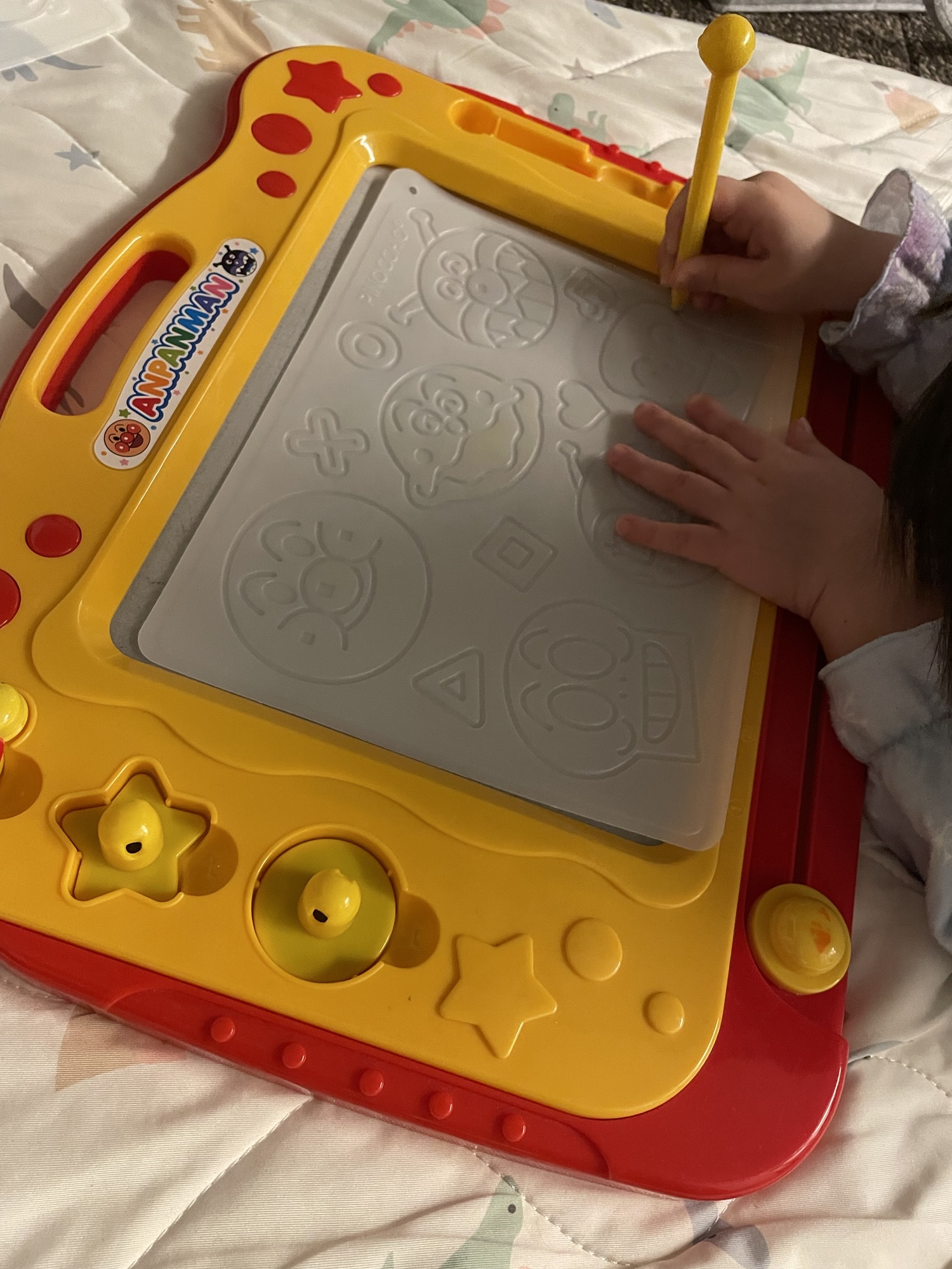 4歳の娘もまだ時々使ってお絵描きをしたり、写し書きできるシートを使ってアンパンマンの仲間を書いたりしています!